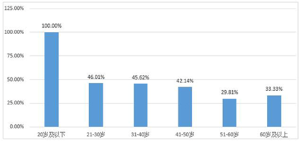 本次抽样调研采取线上调查的方式,受访者1705名。其中0.06%的受访者年龄小于20岁;21岁到30岁的受访者占比34.55%;受访者年龄在31岁到40岁之间占比最大,为42.17%;16.42%的受访者年龄在41岁到50岁之间;51岁到60岁的受访者占比6.10%;仅有0.70%的受访者年龄在61岁及以上。样本中21至60岁的受访者占比超过95%,多为劳动力个体。在受访者中,女性占比51.38%,男性占比48.62%。