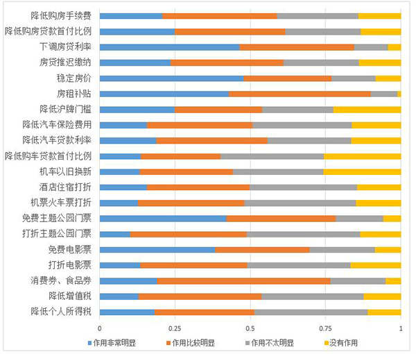 疫情期间的社交隔离政策使得娱乐活动受到很大限制,因此受访者对主题公园和电影院等休闲娱乐场所提供免费和折扣门票的政策呼声也很强烈。同时,调研显示,绝大部分受访者认为减免税收、发放消费券和食品券、酒店和机票打折等措施会比较明显的刺激消费,但并非最为有效。最后,受访者认为汽车购置等优惠政策对刺激消费有一定的作用,但并不明显。