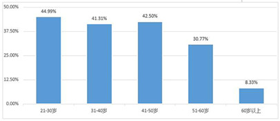 在21岁到30岁的受访者中,44.99%面临收入下滑,在51岁到60岁之间的受访者中有30.77%的人表示月收入有所下降。