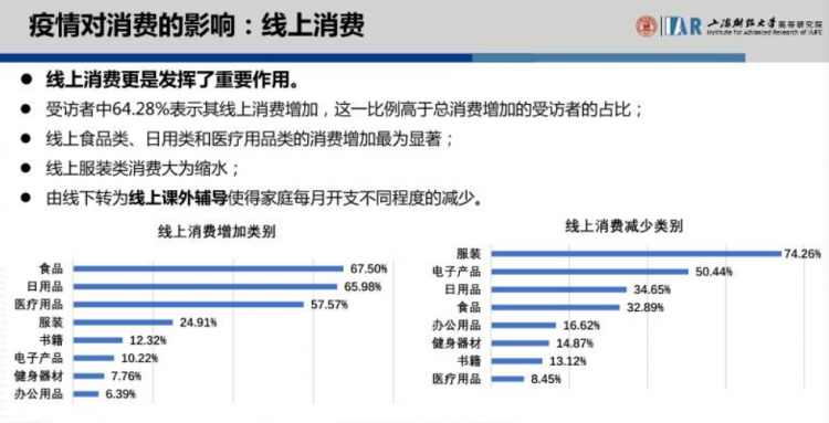 上海财经大学高等研究院近日发布的上海地区消费调查数据显示,新冠肺炎疫情暴发以来,线上消费发挥了重要作用,64.28%的受访者表示其线上消费增加,这一比例高于总消费增加的受访者占比。
