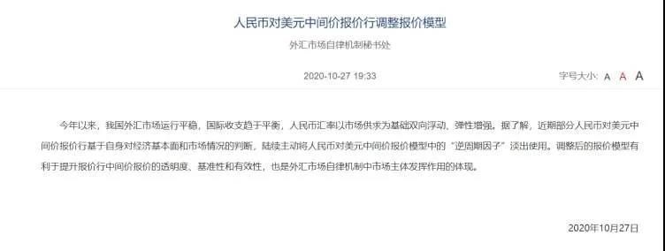 10月27日晚间,外汇交易中心公告称:“今年以来,我国外汇市场运行平稳,国际收支趋于平衡,人民币汇率以市场供求为基础双向浮动、弹性增强。据了解,近期部分人民币对美元中间价报价行基于自身对经济基本面和市场情况的判断,陆续主动将人民币对美元中间价报价模型中的‘逆周期因子’淡出使用。调整后的报价模型有利于提升报价行中间价报价的透明度、基准性和有效性,也是外汇市场自律机制中市场主体发挥作用的体现。”逆周期因子淡出使用被明确,分析师认为,当年央行启用逆周期因子是为了缓解人民币单边贬值预期,如今已经没有必要。在人民币快速升值背景下,央行似乎在进一步释放信号。