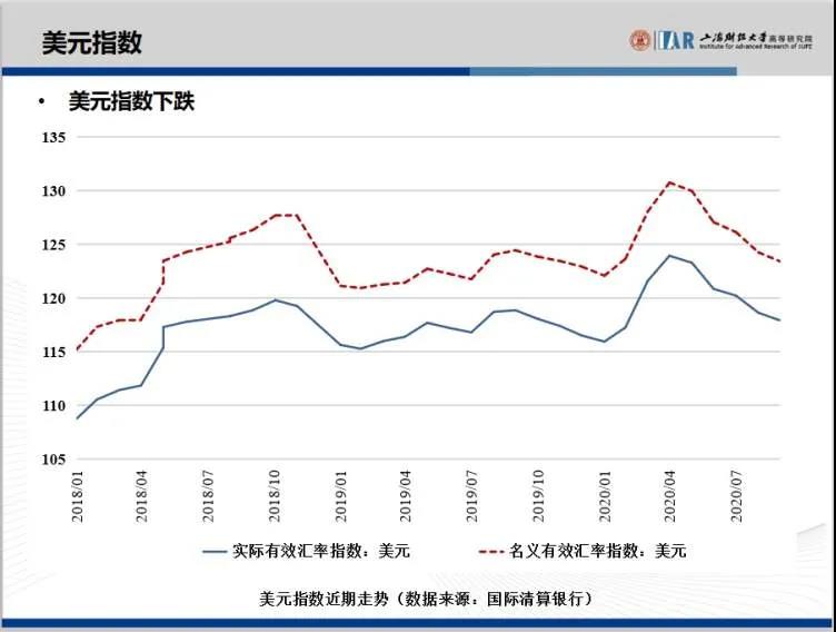 上海财经大学高等研究院“中国宏观经济形势分析与预测”课题组认为,近期人民币升值主要有以下几个影响因素:首先,我国疫情防控走在世界前列,复工复产全面推进,经济率先回暖。其次,由于对美联储宽松货币政策的预期,美元指数下跌。第三,我国货币政策仍留有较大的空间,有助于将中美利差维持在高位,提振人民币资产的吸引力。第四,出口形势良好。最后,随着中国积极的实行金融业对外开放,人民币资产越来越受到国际投资者的青睐,将吸引国际资金流入中国资本市场。