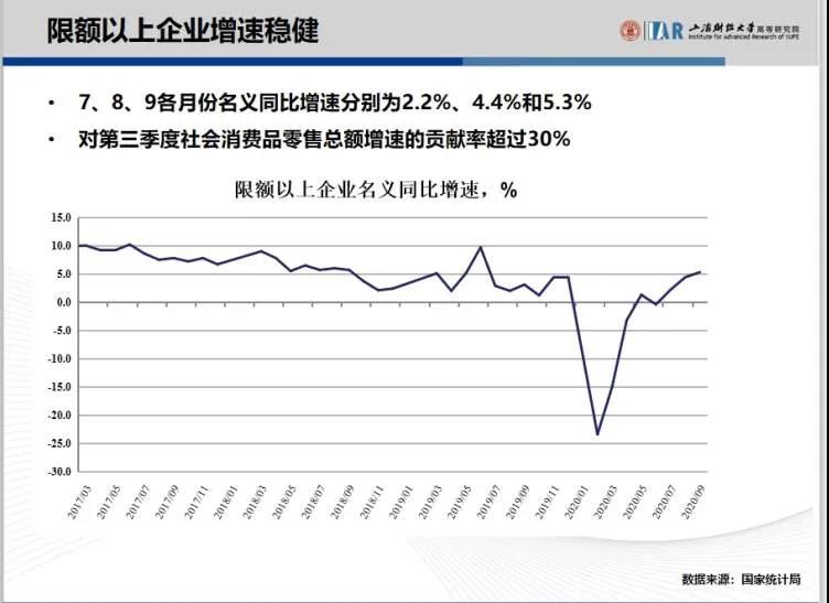 编者按:10月27日下午,上海财经大学高等研究院2020年第三季度中国宏观数据分析研讨会线上线下同步召开,上海财经大学高等研究院“中国宏观经济形势分析与预测”课题组会上发布主题为“以改革开放深化构建内外循环良性互动局面”的《2020年第三季度中国宏观经济形势分析与预测报告》。研讨会邀请到东北证券研究所首席宏观分析师沈新凤、上海国泰君安证券资产管理有限公司研究发展部执行董事薛鹤翔、上海昶元投资管理有限公司总经理张秋、上海财经大学公共经济与管理学院投资系副教授宗庆庆等嘉宾与媒体现场点评互动。发布会由高等研究院院长助理杨有智主持,研究院副院长林立国,院长助理陈媛媛、陈旭东出席会议。