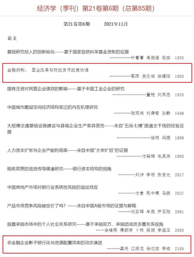 其中,龚关教授的合作论文题为《非金融企业影子银行化与资源配置效率的动态演进》,研究2008年金融危机后,我国出现的非金融企业影子银行化对资源配置效率的动态影响。吴化斌副研究员的合作论文题为《金融抑制、 国企改革与财政货币政策协调》,详细讨论了当经济中存在国企市场势力较强和金融抑制的特征时,货币政策与财政政策对宏观经济的作用机制以及最优政策组合。