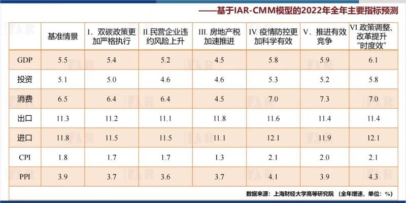 田国强教授强调,应对短期稳中求进问题和中长期高质量发展,更迫切、更重要和更根本的还是要靠深层次的结构性和体制性改革及其治理,这是应对预期转弱压力的最有效对策。改革开放以来的历史经验、实践探索和理论逻辑都表明,改革与不改革,中国经济增长速度相差近3个百分点。站在新的历史起点上,要形成为更大力度的改革开放鼓与呼的和谐气氛和良好的营商大环境,要有具体措施,让中央部署、改革大政方针真正落地,真正让市场在资源配置中发挥决定性的作用,让政府更好而不是更多地发挥作用,以全方位开放倒逼深层次制度改革,谋求更大的发展空间。深层次制度改革有三大重点目标任务:一是形成具有包容性的现代化经济体系;二是提升依法治国能力和政府执行力,建立有能、有为、有效、有爱的有限政府和实现国家治理现代化;三是建立民主法治、公平正义、和谐透明的良好社会规范和秩序以及有效的社会治理体系。随后,黄晓东教授代表课题组对《中国宏观经济形势分析与预测年度报告(2021-2022)》进行了详细解读,探讨风险评估、政策模拟及其治理。面对我国经济总体保持恢复态势,课题组预计全年GDP增速8.0%。课题组充分重视对各种风险的防范和化解,对不同情景下的经济走势、短期政策应对和中长期治理,给出了有针对性的结果和观点。基于上海财经大学高等研究院中国宏观经济预测模型(IAR-CMM)的情景分析和政策模拟结果,课题组测算,在基准情景下,2022年全年实际GDP增速约为5.5%,CPI增长1.8%,PPI增长3.9%,GDP平减指数增长3.2%,消费增长6.5%,投资增长5.1%,出口增长11.3%,进口增长11.8%,人民币兑美元汇率(CNY/USD)将在6.4附近宽幅双向波动。考虑到“双碳”目标严格执行、房地产税的实施、有效竞争推进、民营企业违约风险上升等因素,课题组就6种不同情景得出全年GDP增速分别为5.4%、5.2%、4.5%、5.8%、5.9%、6.1%。课题组还就不同情景下的政策选项给出了建议。