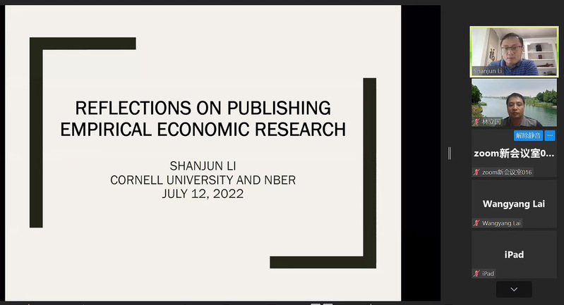 2022年7月12日晚上,美国康奈尔大学商学院肯尼斯·罗宾逊讲席教授、中国经济研究所主任,美国国民经济研究局(NBER)研究员李善军做客上海财经大学高等研究院,讲座主题为“Reflections on Publishing Empirical Economic Research”,在线探讨实证经济学研究内容、实证论文的结构、个人发表经验、担任主编的工作经验等内容。本次讲座由高等研究院副院长林立国常任副教授主持,校内外师生一百多人在线参会并展开交流。